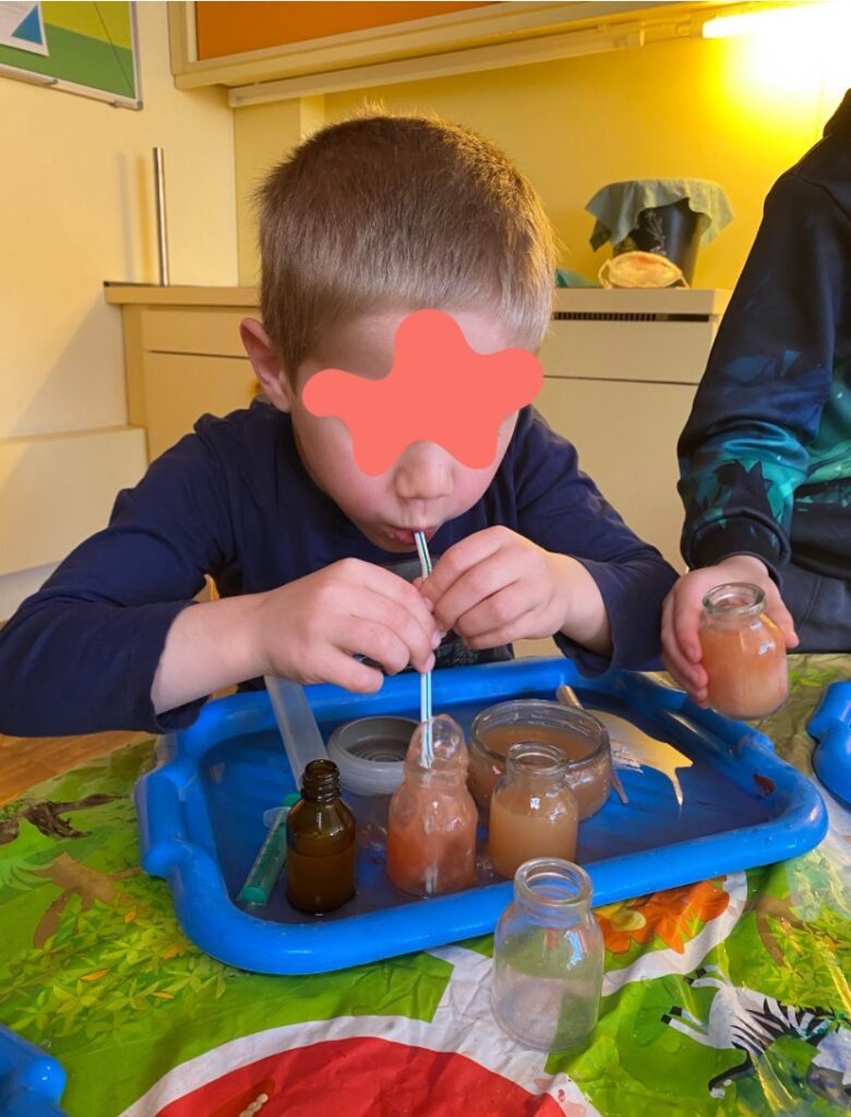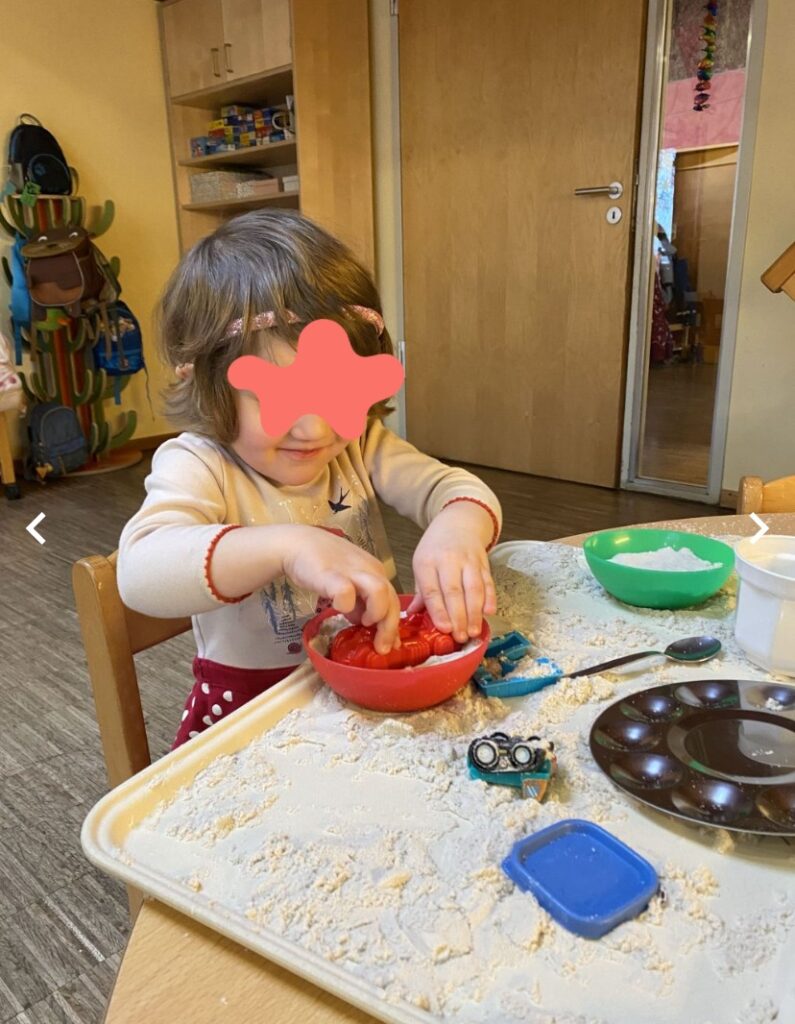 Aktionstabletts sind ein fester Bestandteil eines unserer Spielräume und stehen den Kindern täglich zur freien Verfügung. Sie enthalten unterschiedliche Materialien und Impulse, die zum Ausprobieren, Forschen und Entdecken einladen. Dabei fördern sie insbesondere die Sensomotorik, Feinmotorik sowie die Experimentierfreudigkeit der Kinder.